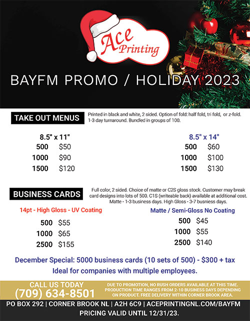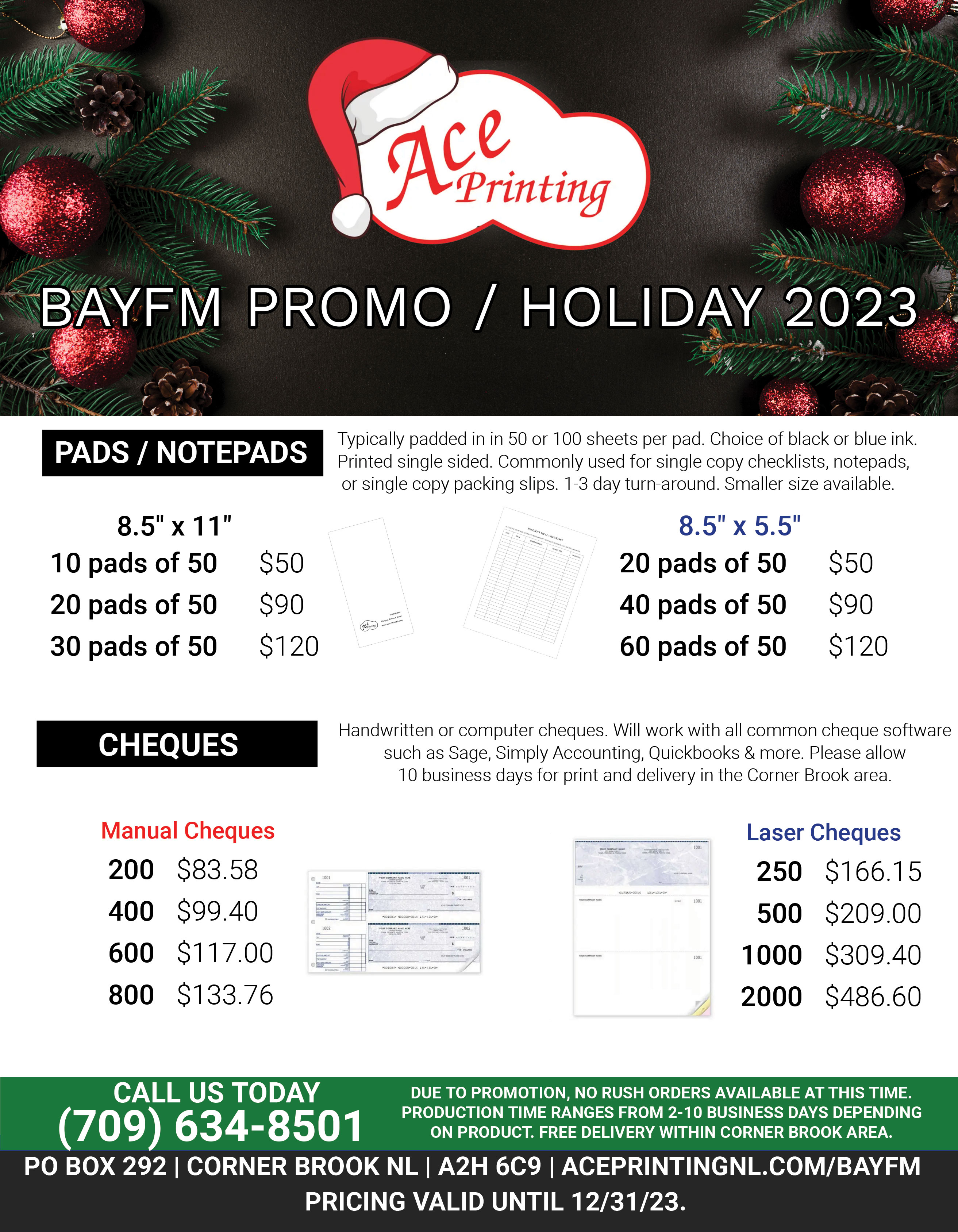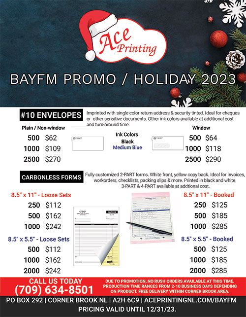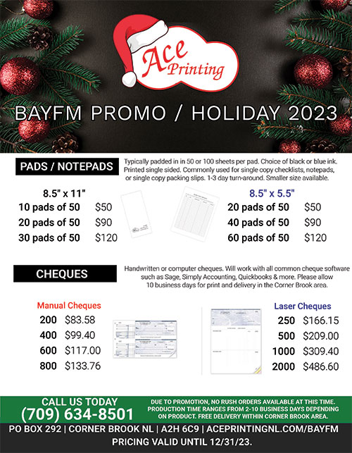 Thank you for your interest in Ace Printing. We are a print shop located in Corner Brook and specialize in business to business printing. We have been operating for over 30 years and carry a wide range of print products to help with your business needs from carbonless forms to cheques and more. On this page you will find our current local promotions which include free delivery within the Corner Brook area. If you require any help please do not hesitate to contact us. While you are free to order from our site, it is recommend that you place your order by e-mail or phone to take advantage of our local pricing.